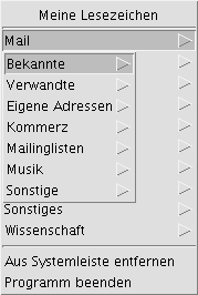 Wenn das Programmsymbol ![]() Zum Aktivieren eines Eintrags genügt ein einfacher Mausklick. Allerdings sind hier die zusätzlichen Texte nicht sichtbar und HTML-Formatierungen haben keine Wirkung. Veränderungen an den Einträgen können nur im Hauptfenster vorgenommen werden. Ganz unten im Menü gibt es zusätzliche Punkte zum Entfernen aus der Systemleiste sowie zum Beenden des Programms. Wurde das Symbol aus der Systemleiste entfernt, wird es beim nächsten Minimieren des Hauptfensters wieder eingetragen, sofern die entsprechende Option noch aktiv ist. Ein Linksklick auf das Systemleisten-Symbol bewirkt, dass das Hauptfenster wieder in normaler Größe dargestellt wird. |